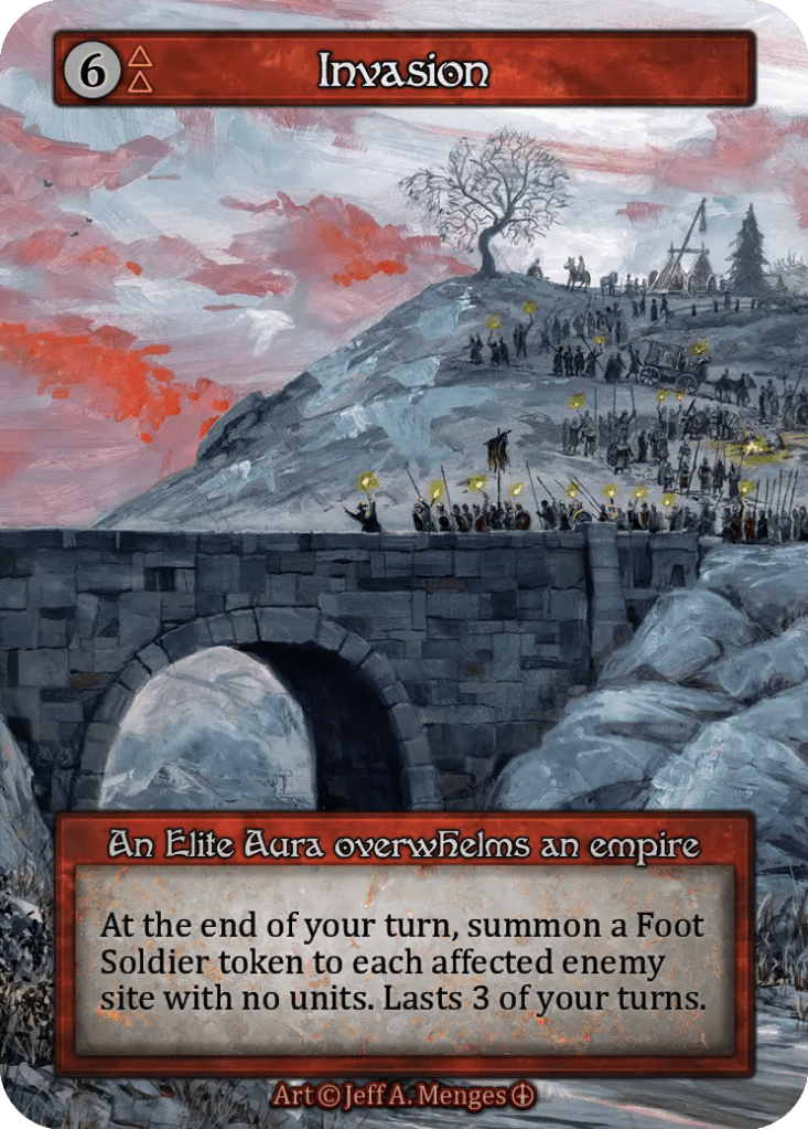 Only one Fire threshold. This makes it easy to splash in decks that aren’t primarily fire. An example of a card that competes for this slot in my decks is Firebreathing. Firebreathing is a removal spell that can deal with four-power minions, hit the opponent’s Avatar, and has an area of effect. Your horse can even cast it, as an added bonus. But the frequency in which I’ve missed hitting my second Fire site in Air-dominant lists is frustratingly high, so Infiltrate might be the more consistent choice.