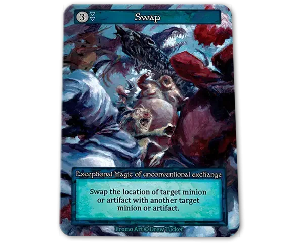 Undead Ambush at Exceptional gets to be a bit more powerful and a bit more complex, and the flavour and execution of this card is fantastic. The optimal result is receiving four Skeletons for three mana, but there is a subtle restriction to this determined by the amount and placement of sites in play when you cast the Ambush. The power and flexibility of this card grows as the game goes longer as there will be more sites. Also it’s interesting to note that you get more tokens if you use it aggressively to the middle of the board rather than defensively around a minion attacking your back row.