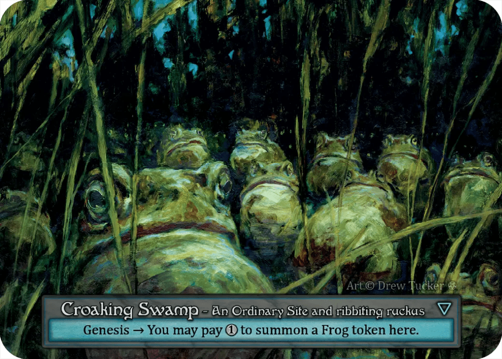 A flavour distinction between the two designs is the number of frogs depicted in the art and type line. My site depicted a solitary frog, and Croaking Swamp depicts a slimy horde. This could be one of those situations where the art received from Drew Tucker determined the final outcome.